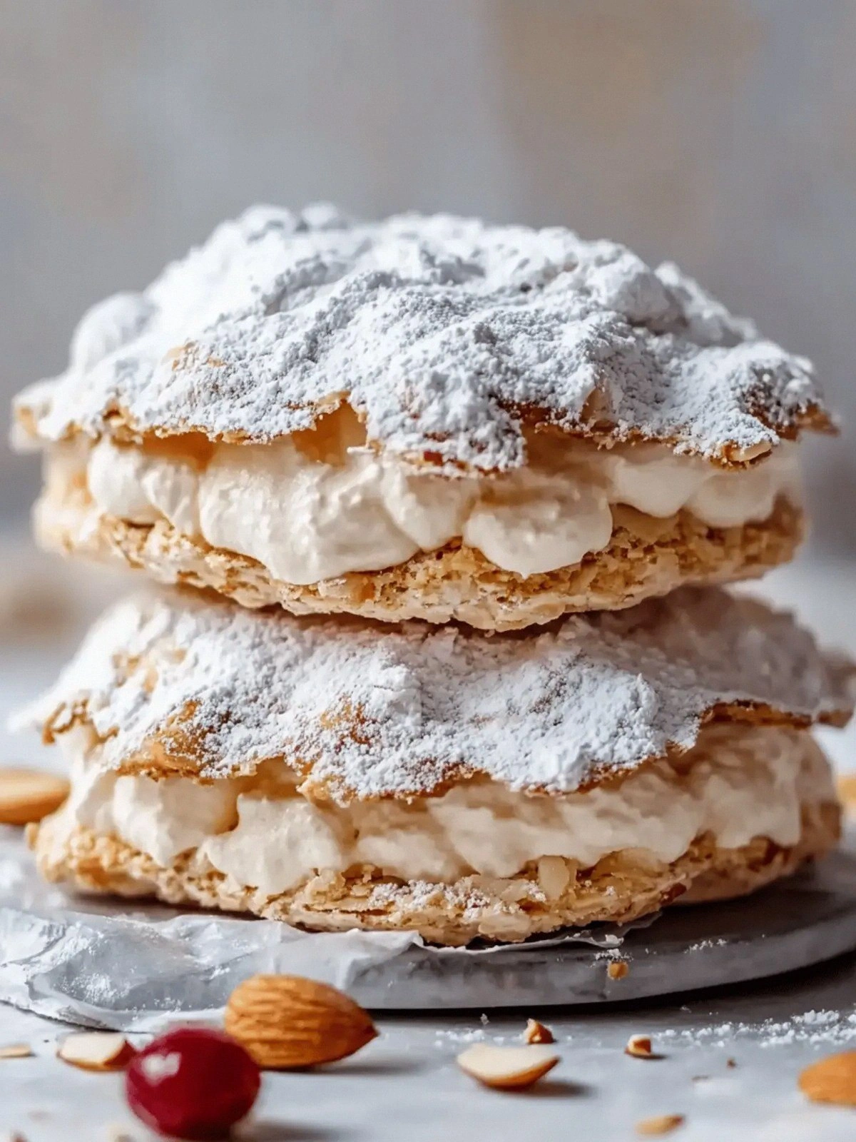 Once the dacquoise is assembled, dust it with a light layer of powdered sugar, which adds a delicate sweetness and a subtle visual sheen. For an extra touch of elegance, top the whipped cream with more sliced almonds, creating a layered effect that looks as good as it tastes. If you’re craving a touch of citrus, a few drops of lemon zest can brighten the flavor without compromising the almond base. And remember: the key to a perfect finish is to keep the whipped cream light; over‑whipped cream will become grainy and lose its airy quality.